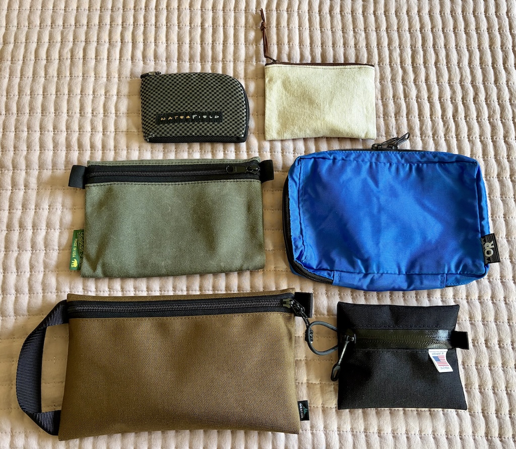 Of late, I’ve had to juggle things between my two cars. That means a little bag that fits nicely into the map holder of my car’s driver’s side map holder. Here are my small bags gathered for a group photo.